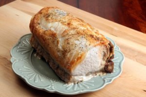 - A húst megszórjuk borssal, majd beleforgatjuk a fűszeres olajba (vagy bekenjük vele). Tepsibe tesszük, a tetejét betakarjuk a szalonna szeletekkel.